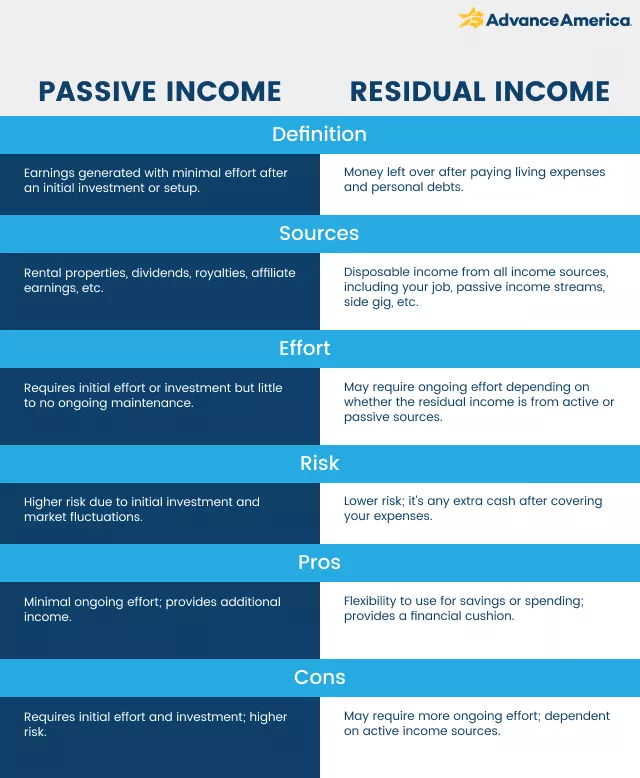 In the world of personal finance, it’s important to know what passive and residual income are and how they work. Passive income is money earned outside of your job and with little effort. Residual income, on the other hand, refers to all the income you have left after your personal and living expenses are paid.